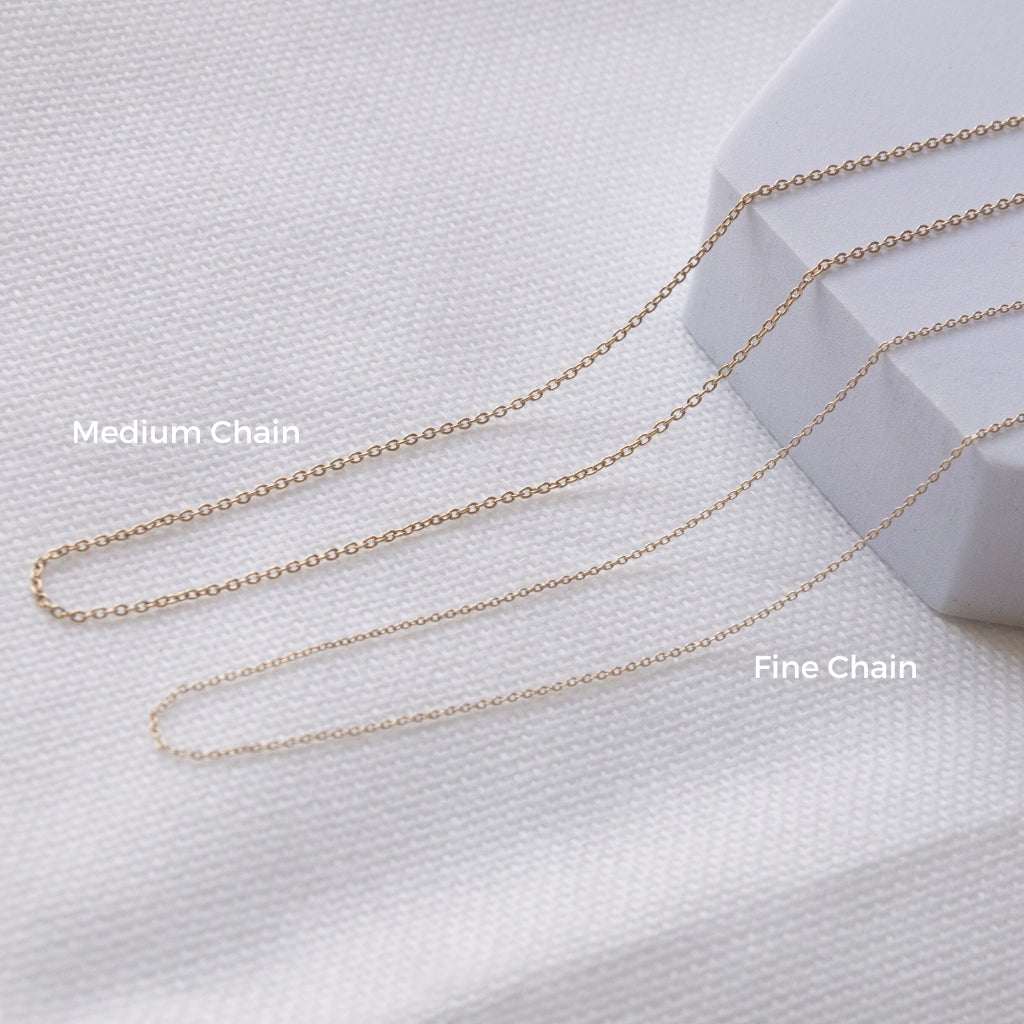 This necklace comes with a choice of a fine weight chain or a medium weight chain.