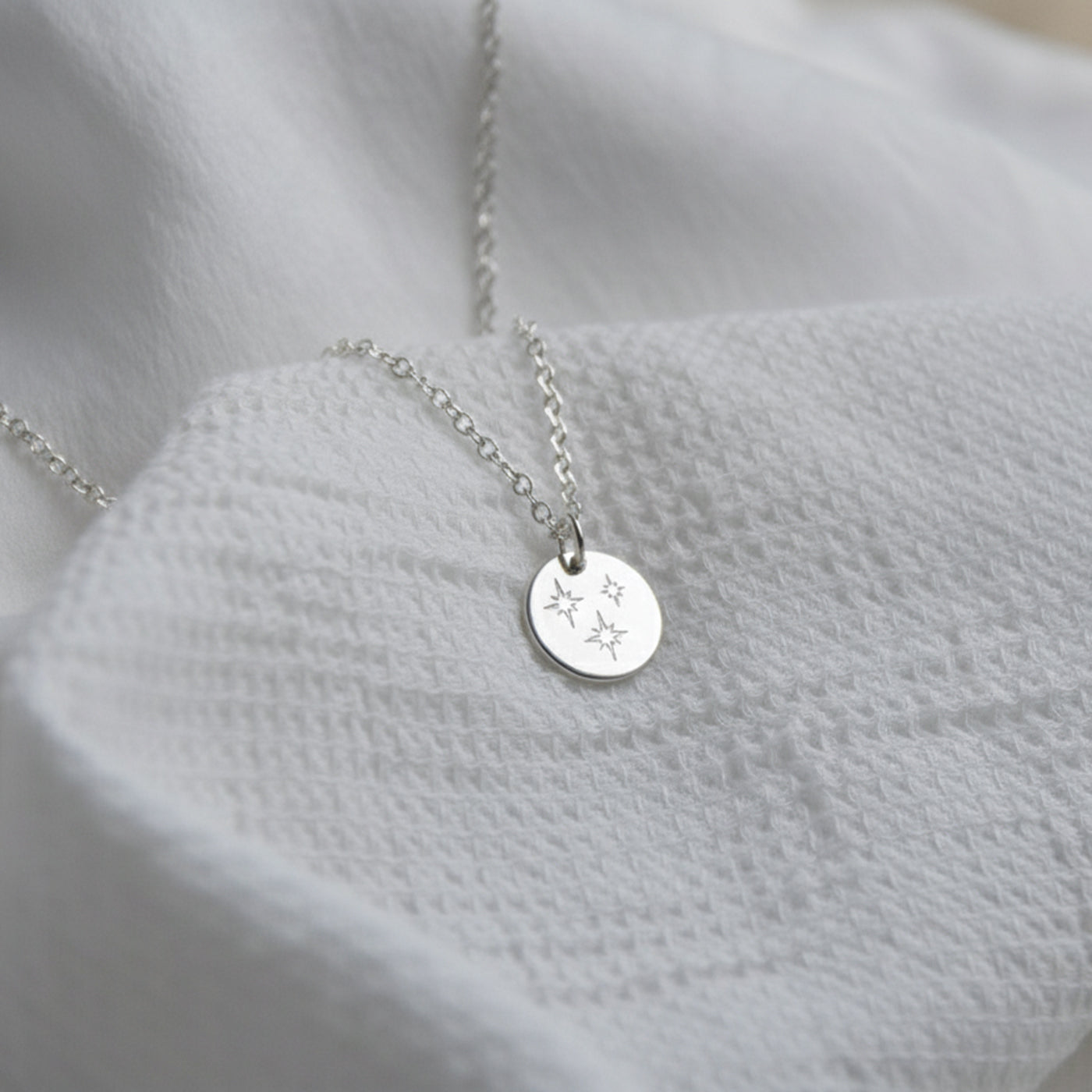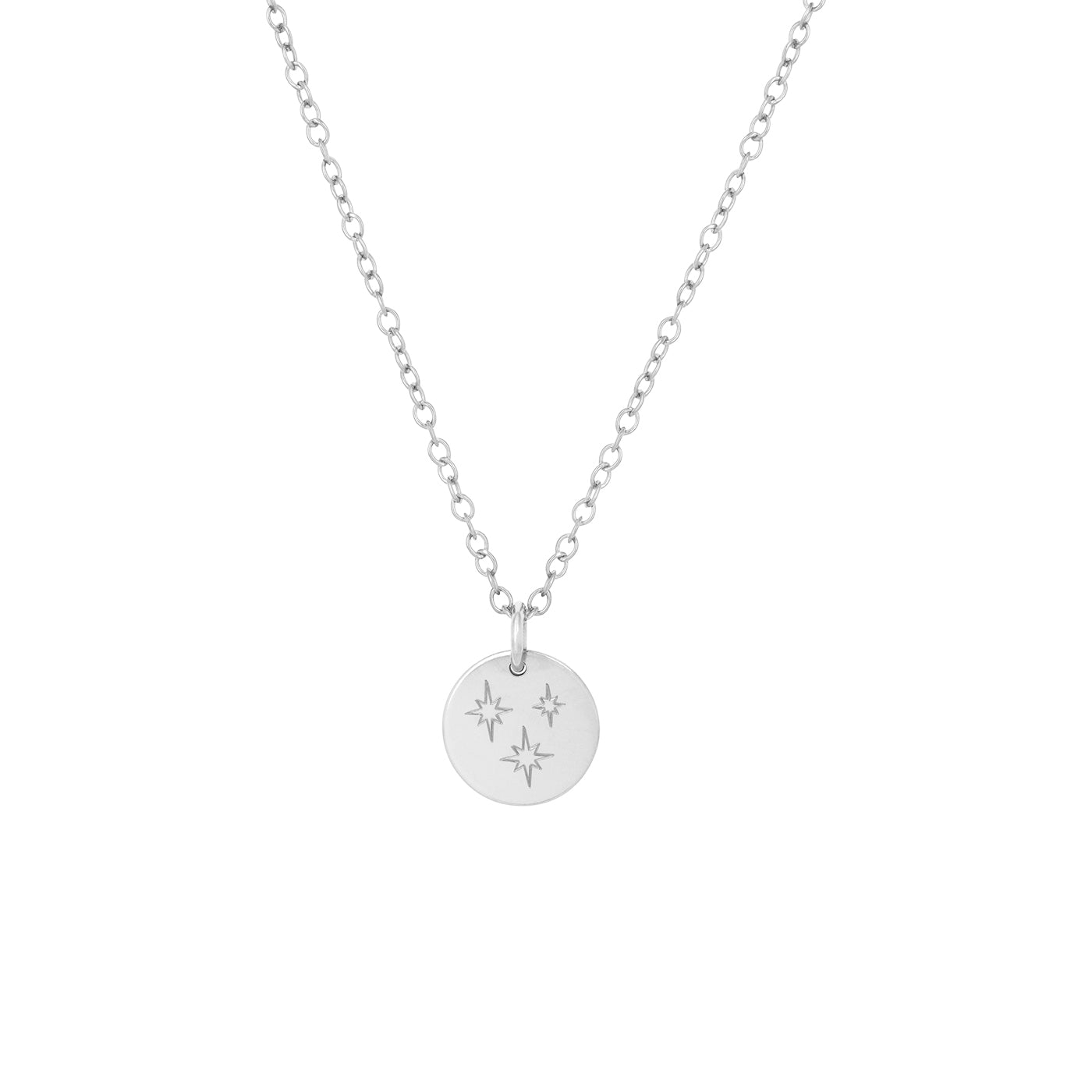 Our gorgeous trio of stars pendant in silver is a lovely minimal disc necklace hand-stamped with three north stars, two big and one smaller.